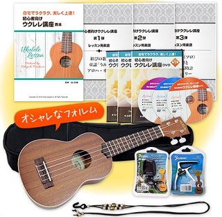 ウクレレ本体、ソフトケース、ストラップ、カポタスト、チューナー、ウクレレ講座DVDセット