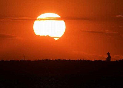 霞ケ浦の南西方向に見える富士山頂に太陽が沈む瞬間、富士山の稜線に太陽が重なり、ダイヤモンドのように輝きます。