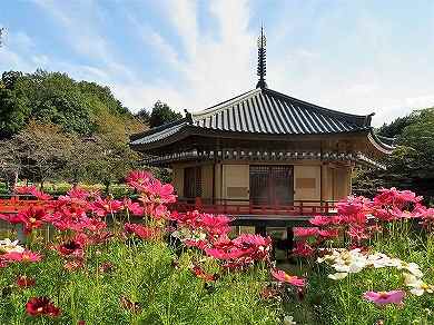 特徴: 法起寺の周囲に広がるコスモス畑が、歴史的遺産と共に美しい風景を作り出します。特に三重塔を背景にしたコスモスは絶好の撮影スポットです。